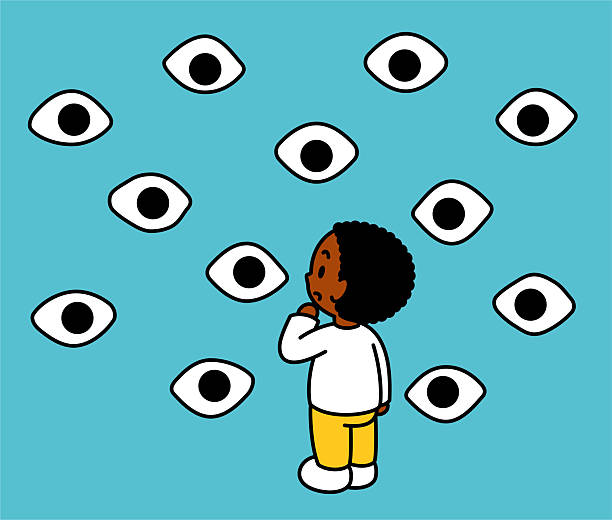 Minimalist Style Characters Designs Vector Art Illustration. A cute boy is surrounded and watched by many strange, large eyes. This is a three-quarter rear view, with a black outline and flat colors, in a minimalist style.