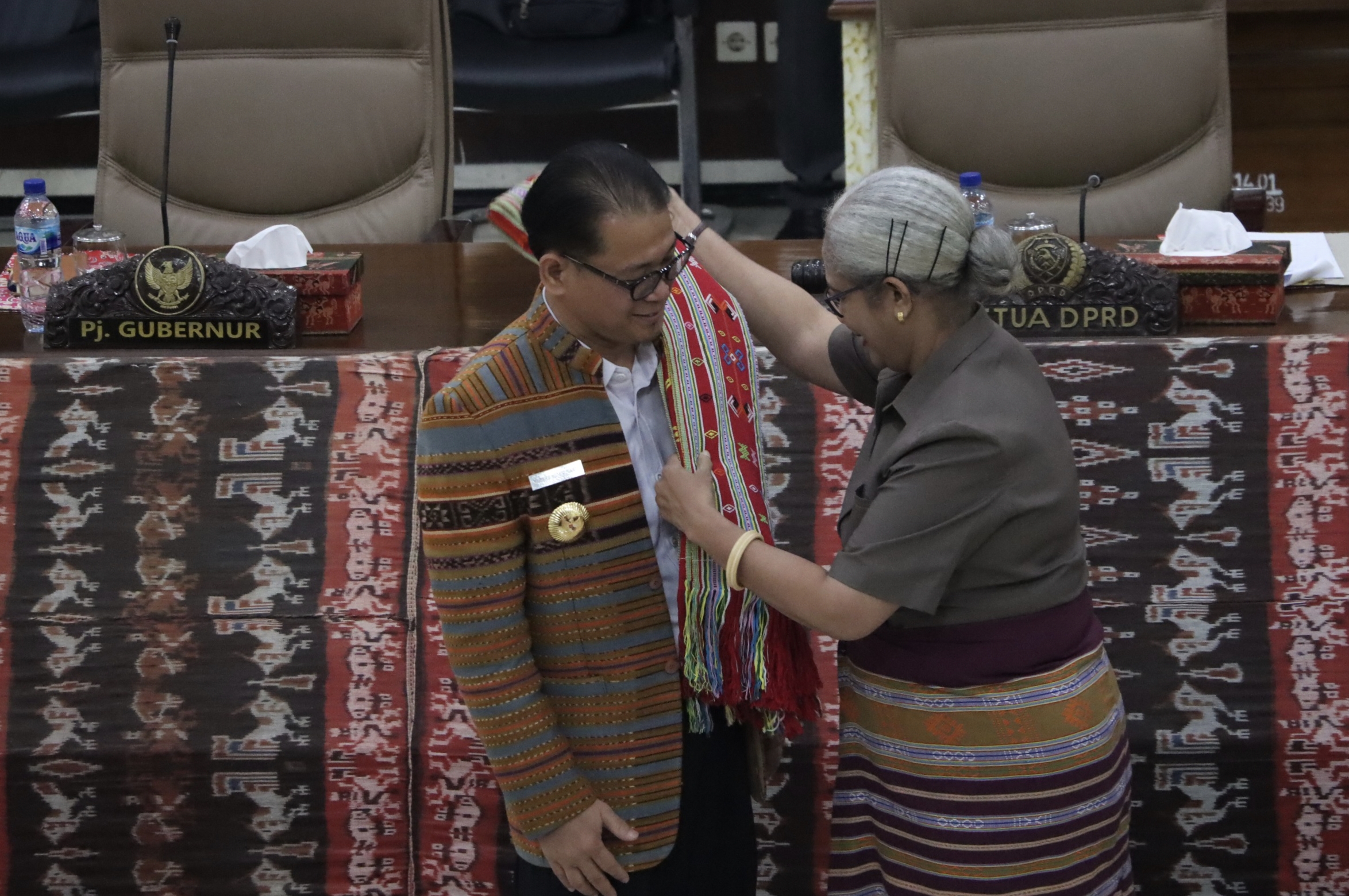 RADARNTT, Kupang – Penjabat Gubernur NTT, Andriko Noto Susanto menghadiri Rapat Paripurna Perdananya ini disambut oleh Ketua Sementara DPRD Provinsi NTT, Emilia Nomleni dan didampingi Wakil Ketua Sementara DPRD Provinsi NTT, Fernando Osorio Soares dengan pengalungan Kain Tenun Nunkolo dari Kabupaten Timor Tengah Selatan (TTS)