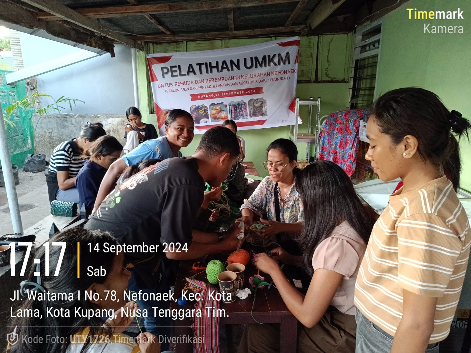 Pelatihan cara membuat souvenir Lilin dari minyak jelantah dan bunga hias dari kain tenun perca. Pelatihan dilaksanakan di Kelurahan Nefonaek Kecamatan Kota Lama, diikuti 30 orang mahasiswa.
