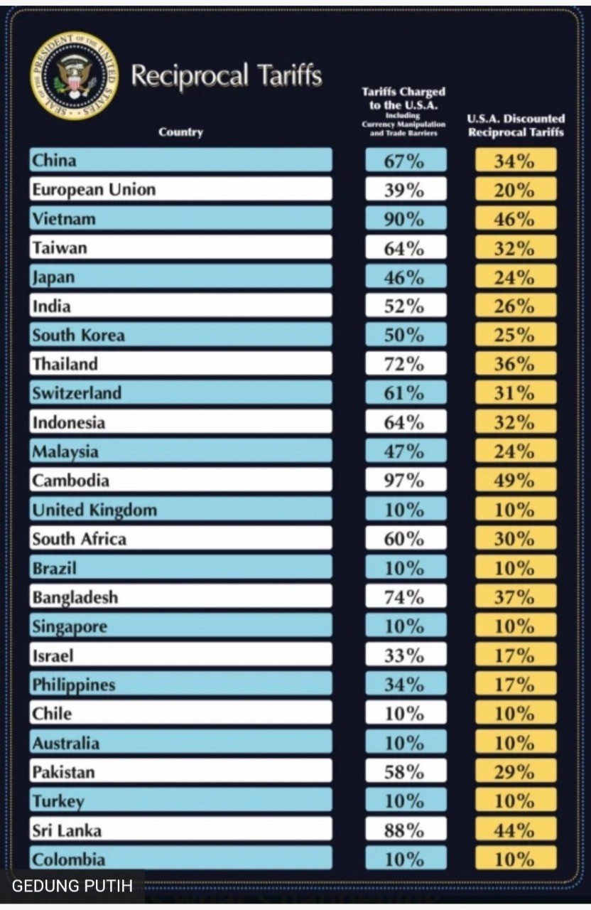 Indonesia, memberlakukan tarif sebesar 64 persen terhadap barang-barang impor dari Amerika Serikat. Sebaliknya, Amerika Serikat memberlakukan tarif sebesar 32 persen pada produk impor dari Indonesia. Setelah analisis yang mendalam, teridentifikasi setidaknya 10 dampak negatif langsung dan berantai yang dihadapi Indonesia sebagai akibat dari penerapan tarif tinggi tersebut, yang mencakup:
