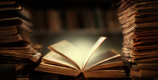 Magical book lying open on desk in library. Glowing pages illuminates surrounding.