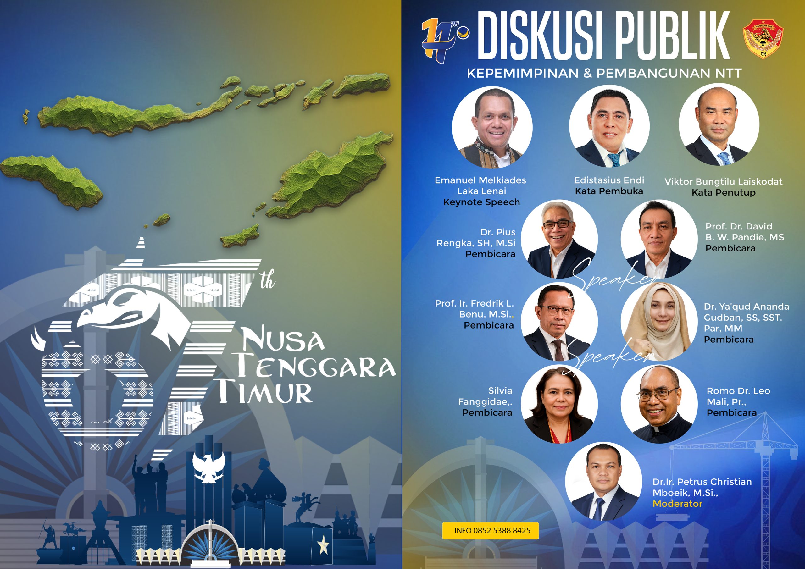 Diskusi Publik juga memghadirkan sejumlah pembicara berpengaruh, yaitu Dr. Pius Rengka, SH., M.Sc, Prof. Dr. David B.W. Pandie, MS, Prof. Ir. Fredrik L. Benu, M.Si, Dr. Ya’qud Ananda Gudban, SS., SST.Par., MM, Silvia Fanggiade, dan Romo Dr. Leo Mali, Pr.
