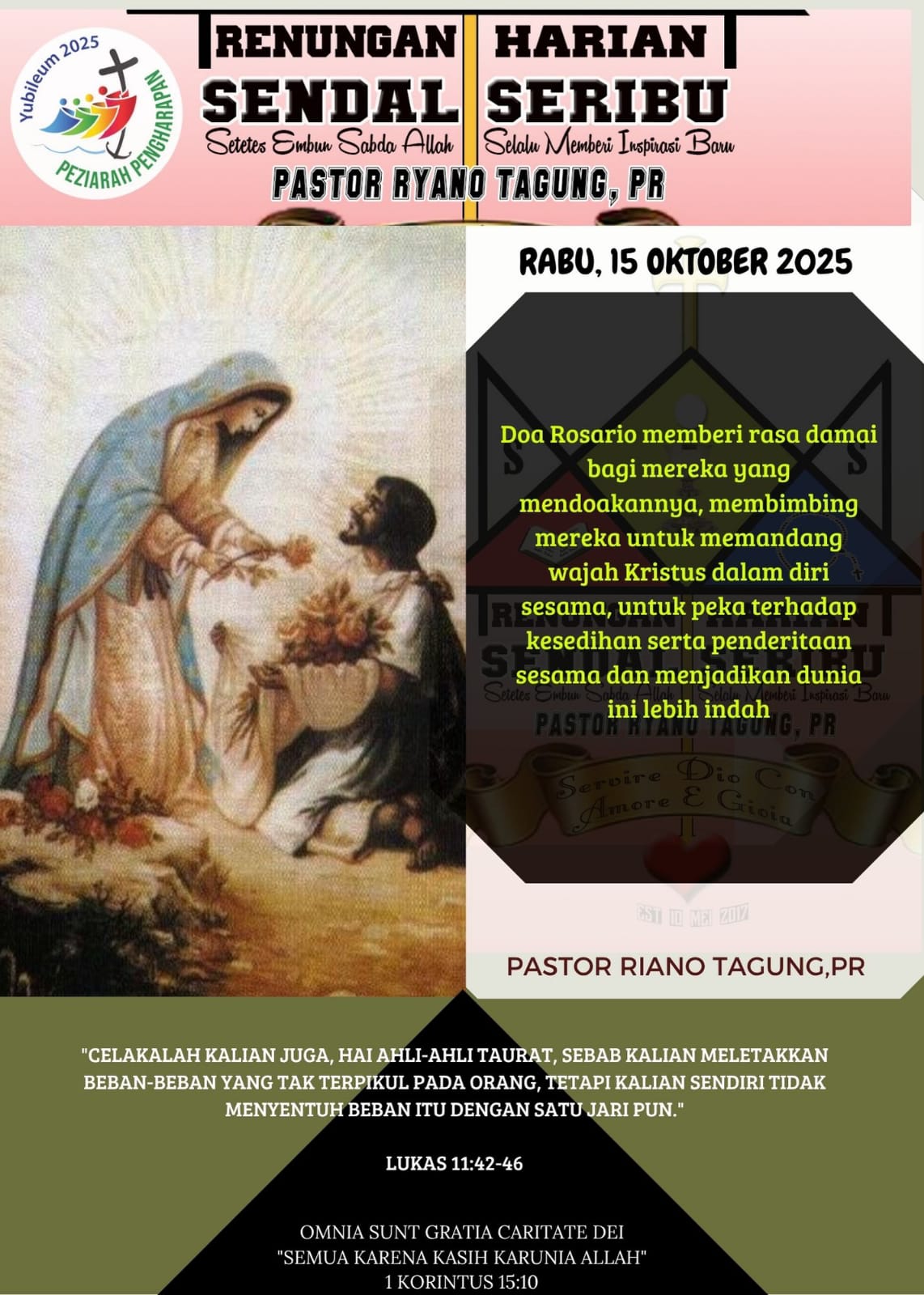 DI BULAN ROSARIO INI, baiklah kita patrikan kata-kata ini di dalam hati kita, “Doa Rosario memberi rasa damai bagi mereka yang mendoakannya, membimbing mereka untuk memandang wajah Kristus dalam diri sesama, untuk peka terhadap kesedihan serta penderitaan sesama, serta membangkitkan kerinduan untuk menjadikan dunia “lebih indah, lebih adil, lebih selaras dengan rencana Tuhan.” (Paus Yohanes Paulus II).