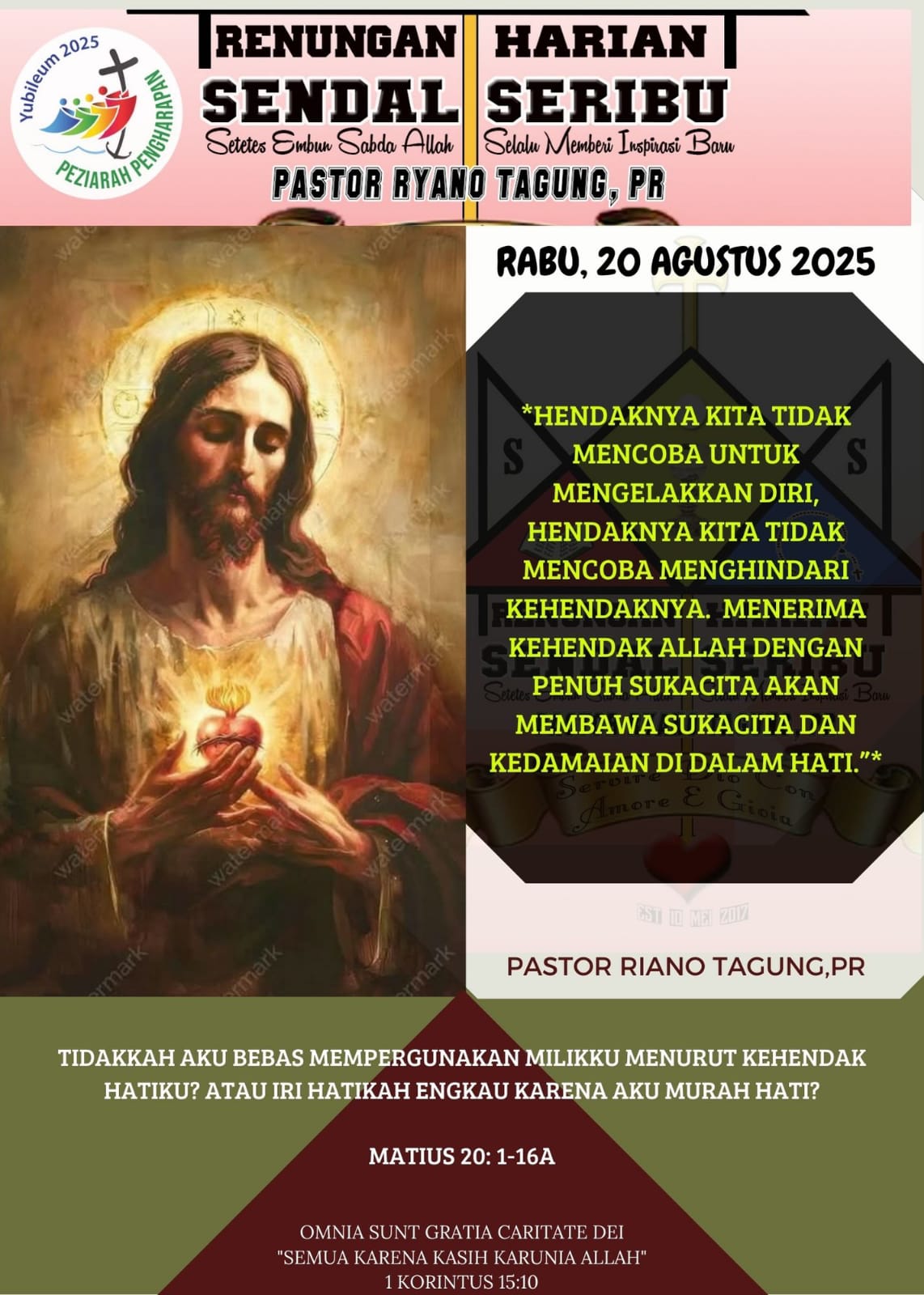 Pada hari ini kita mendengarkan perumpamaan tentang upahan para pekerja di kebun anggur. Melalui perumpamaan ini kita melihat betapa besar kemurahan hati ALLAH bagi semua orang tanpa terkecuali. ALLAH yang mahamurah, telah memanggil kita semua untuk bekerja bagiNya dan bagi tegaknya Kerajaan Allah. Setiap keputusan kita untuk bekerja mengikutiNYA di jalan panggilan ini akan mendapatkan upah seturut rencana dan kehendakNya.