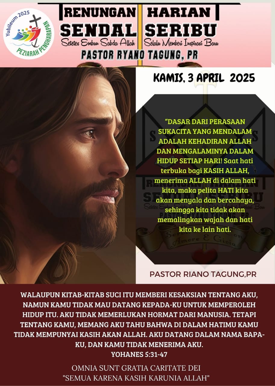 Mari kita kembali ke dalam RUANG HATI KITA saat ini, apakah di sana ada getaran kasih akan ALLAH sebab kita mengalamiNya dalam hidup harian kita? Mari kita ajak juga setiap anggota keluarga dan komunitas kita untuk bisa merasakan dan mengalami secara pribadi KASIH ALLAH yang sungguh mencintai dan mengasihi kita agar segala perbuatan dan karya yang kita lakukan pada hari ini sungguh kita lakukan seturut rencana dan kehendakNya.